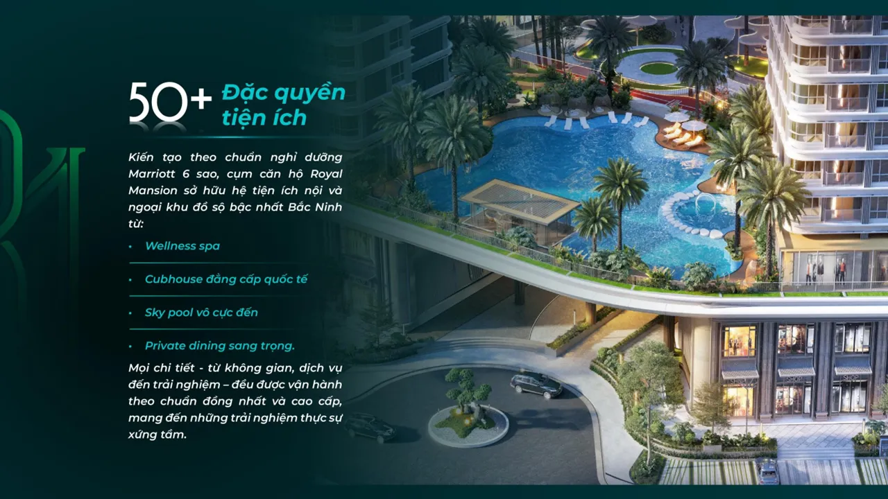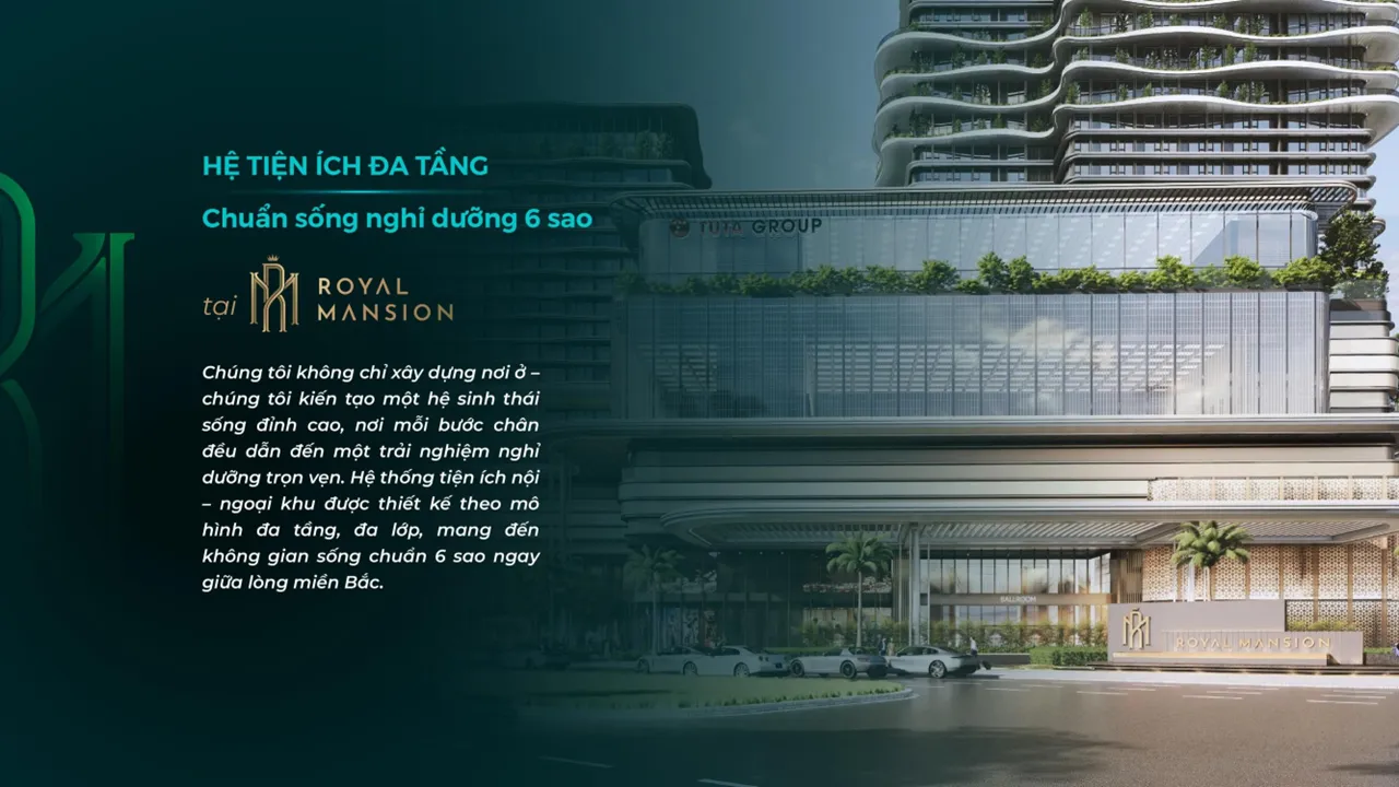 Royal Mansion Tower – 4 tòa tháp căn hộ cao cấp biểu tượng kiến trúc Paris tráng lệ lần đầu tiên xuất hiện tại Bắc Giang, nơi hội tụ của các thương hiệu quốc tế hàng đầu như: Marriott – Tập đoàn Khách sạn lớn nhất thế giới từ Hoa Kỳ, Aedas (Anh) – Đơn vị thiết kế kiến trúc top 5 thế giới, cùng thiên đường mua sắm hoành tráng nhất, vui chơi giải trí, chăm sóc sức khoẻ cao cấp bậc nhất như: trung tâm hội nghị quốc tế với sức chứa trên 2000 chỗ ngồi, E-casino đầu tiên, khu vui chơi giải trí, những con phố hàng hiệu… ngay trung tâm thành phố Bắc Giang.